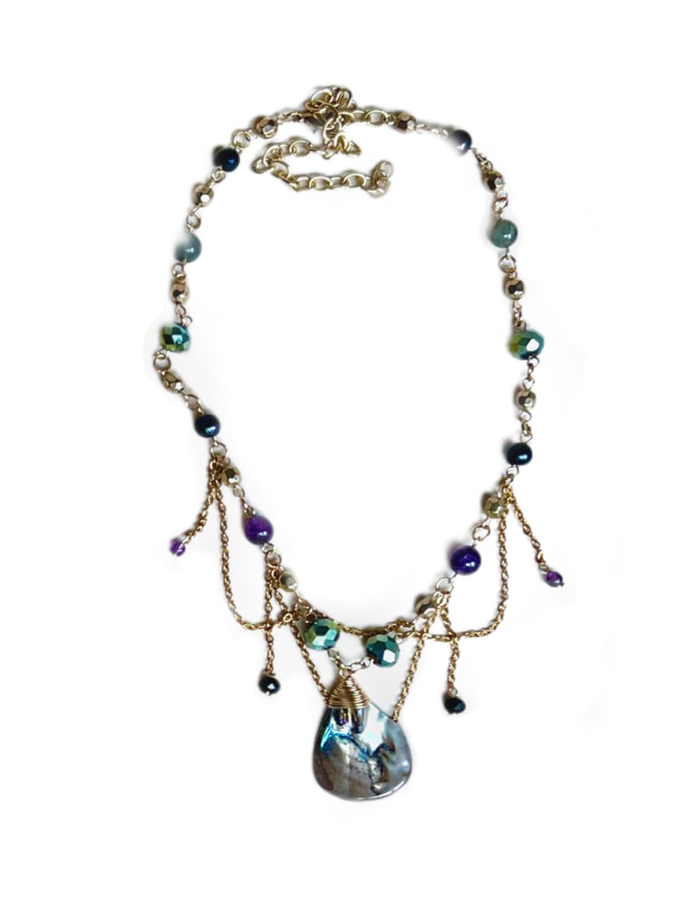 Enchanted with the intention of growth and prosperity. This necklace includes one Mother of Pearl pendant and Amethyst, Labradorite, and Tourmaline crystal beads cleansed and wrapped with Flash Plated Gold or Sterling Silver Wire.