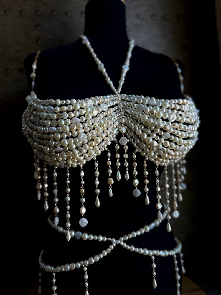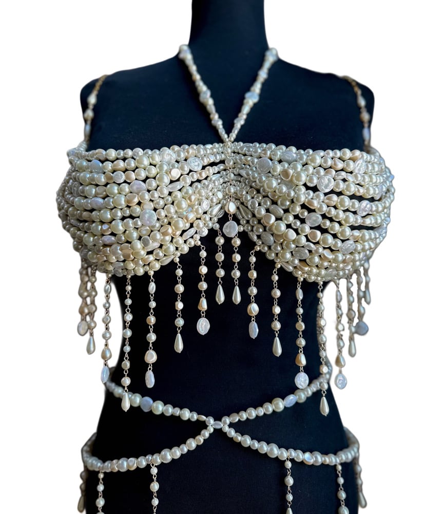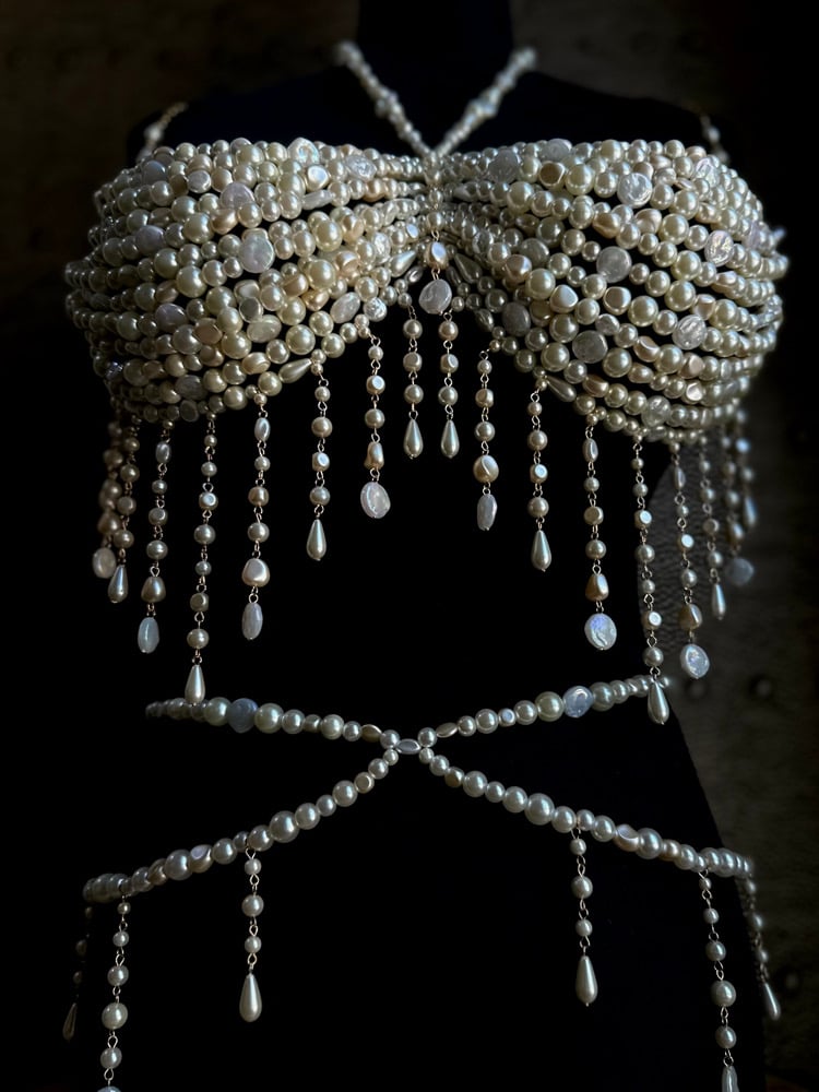 This Pearl Beaded Bralette is handmade using fresh water pearls, and flat coin pearls. A care sheet with instructions will come with your bralette.