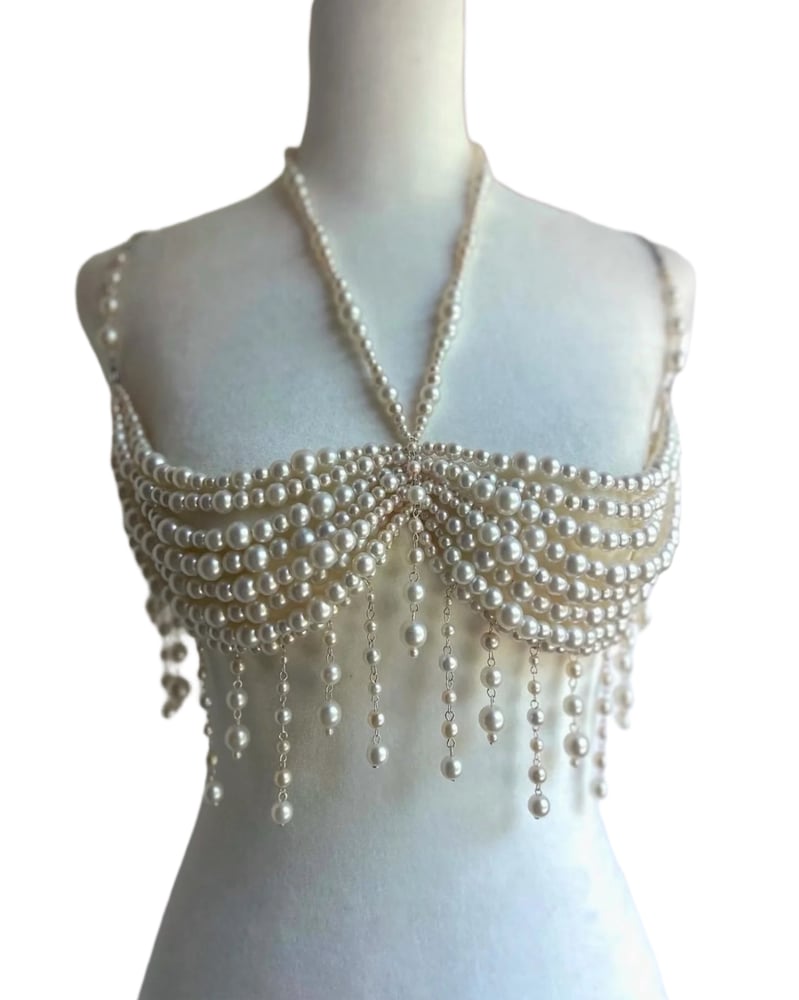 This beaded bra is made using glass and authentic pearls. A care sheet with instructions will come with your order.